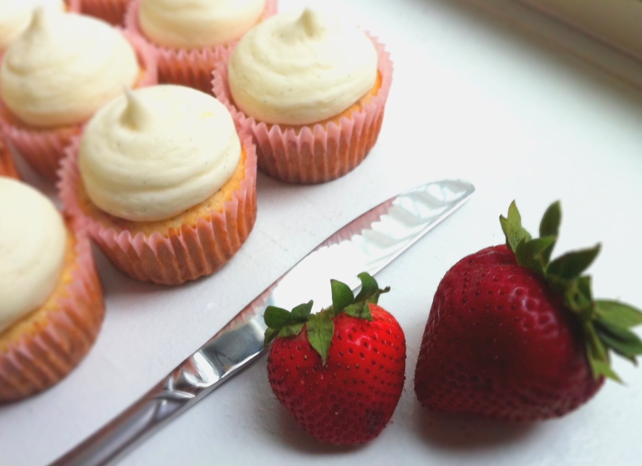 "Les Fraises" are summer strawberry cupcakes topped with a whipped pillow of vanilla bean and lemon cream cheese buttercream. Have you ever seen the way water beads up on the side of freshly washed fruit? Fresh, cold, dripping. That is a true summer sweat.